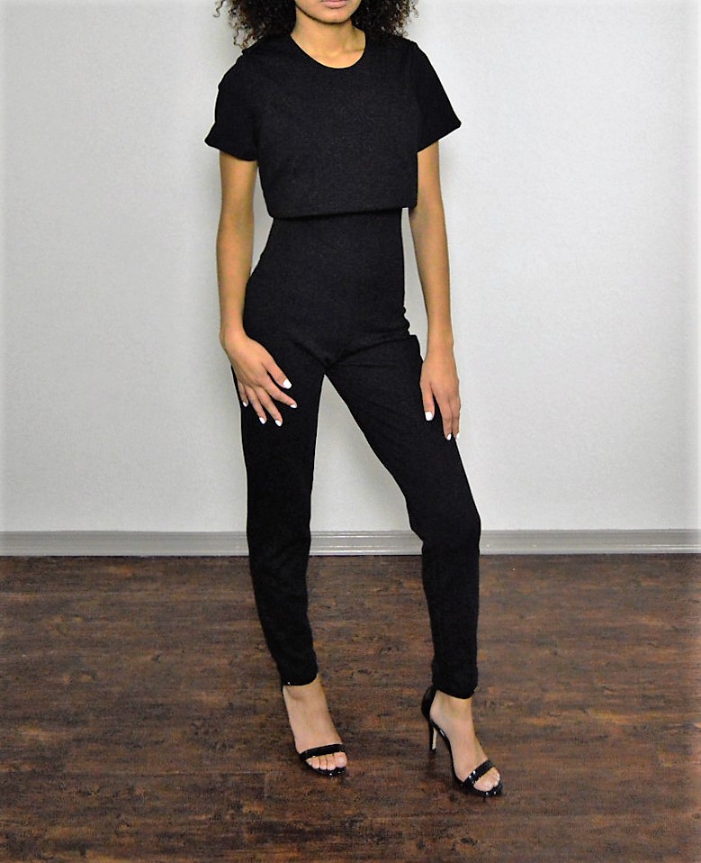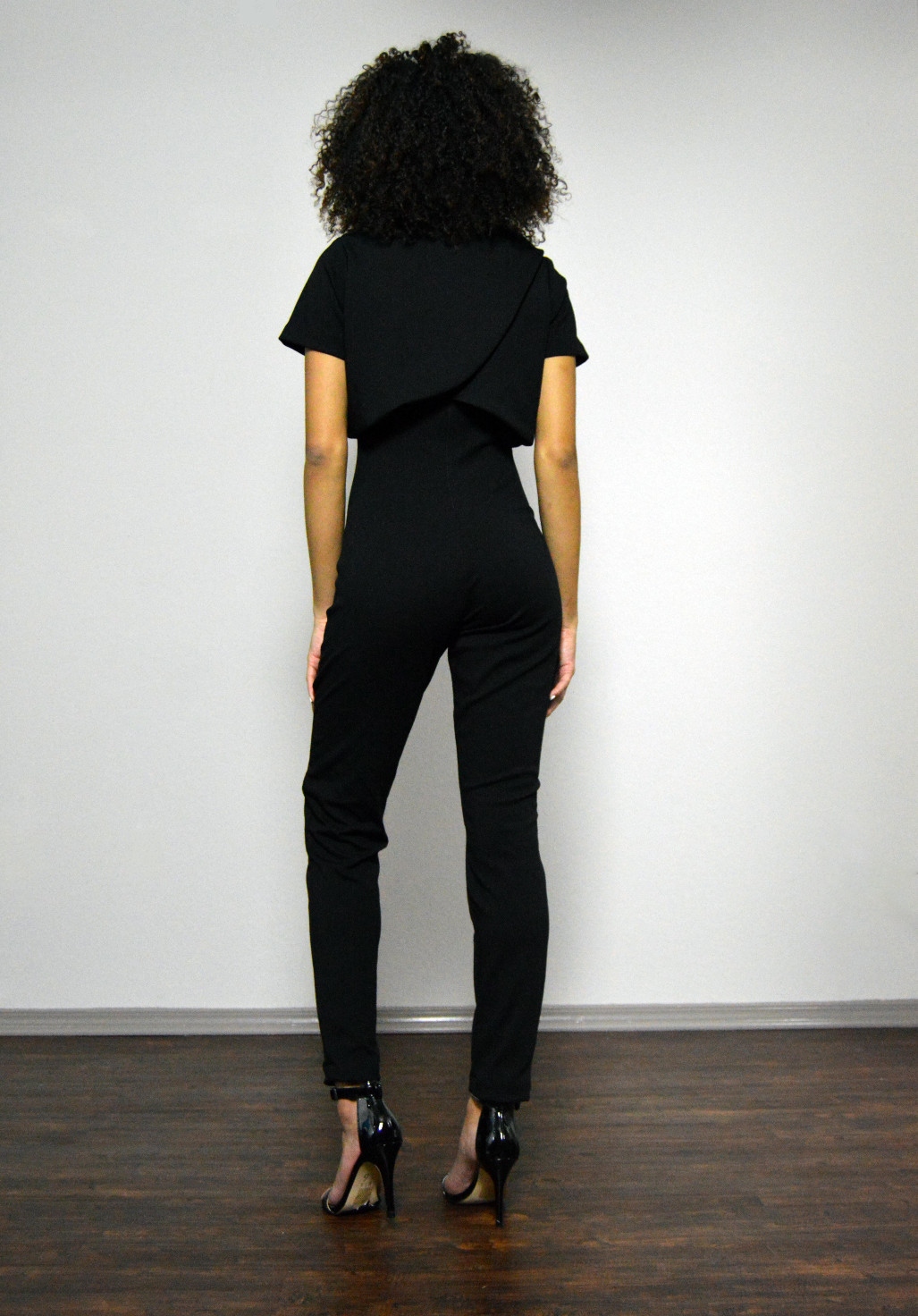 Fitted jumpsuit with cropped top and rose petal detailed back